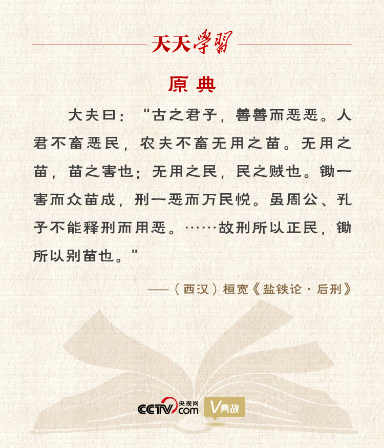 《盐铁论·后刑》聚焦用刑问题。贤良文学之士反对严密而烦琐之法,主张“德主刑辅”“先德后刑”。御史大夫一派更注重刑罚的威慑力,主张“锄一害而众苗成,刑一恶而万民悦”。意思是锄掉一株杂草,能使众苗茁壮成长;惩治一个恶人,能使万民欢欣鼓舞。