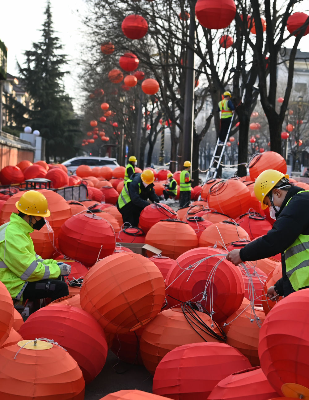 1月15日,施工人员在西安市慈恩东路悬挂红灯笼,迎接春节。新华社记者 陶明 摄