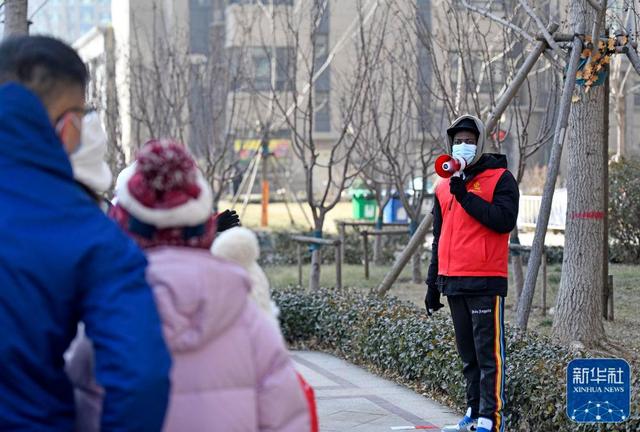 在天津市东丽区东丽湖街道绿洲花园社区核酸检测点,万森用喇叭引导居民进行核酸检测(1月15日摄)。