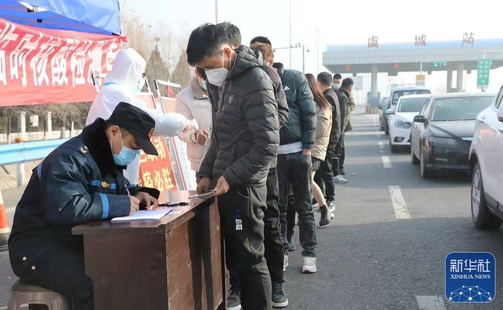 1月13日,商丘市虞城县开展第二轮全员核酸检测。图为虞城刘店高速收费站出站口,返乡人员在进行信息登记,随后将接受核酸检测。(周谦摄)