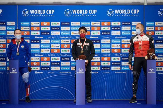 2021年11月13日,在国际滑联速度滑冰世界杯波兰站男子集体出发赛的颁奖仪式上,俄罗斯的鲁斯兰·扎哈罗夫(左)、日本的小林正人(中)和波兰的兹比格涅夫·布罗德卡(右)。新华社发