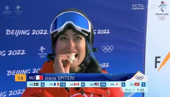 马耳他选手珍妮丝在等待成绩的间隙吃起了豆包。(转播视频截图)