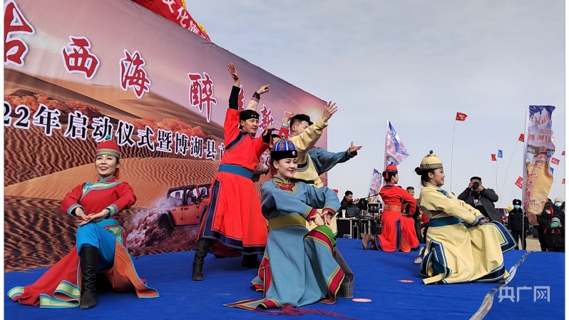 2月19日,航拍新疆2022年启动仪式暨博湖县首届沙漠文化旅游节在博斯腾湖乡艾勒逊乌拉沙漠盛大开幕。国家级非物质文化遗产蒙古族刺绣作品、蒙古族传统服饰以及传统手工艺品成为活动上的一道靓丽风景线。