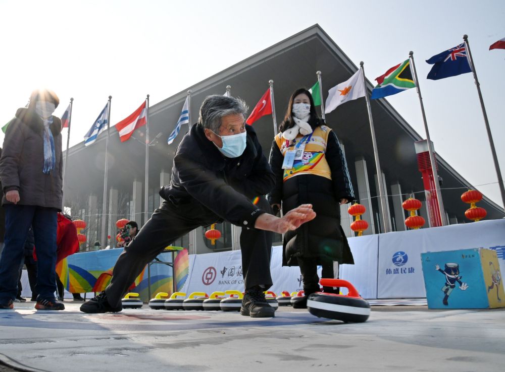 1月8日,一位市民在中国冰雪大篷车百场巡回青岛站活动中体验旱地冰壶。新华社记者李紫恒摄