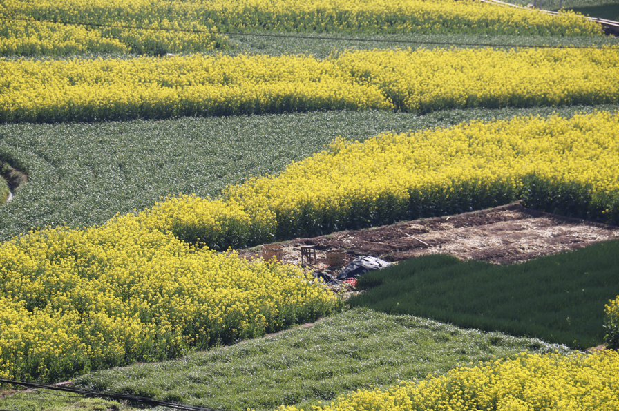 农田里油菜花层层起伏,宛若千层波浪在绿海翻涌,整个土地像披着一块金黄的毯子,它们拥抱着初春,感触着暖阳,沉浸在春天的美好里。阵阵菜花香随风飘来,景美心畅,芳香扑鼻,怡然自得。