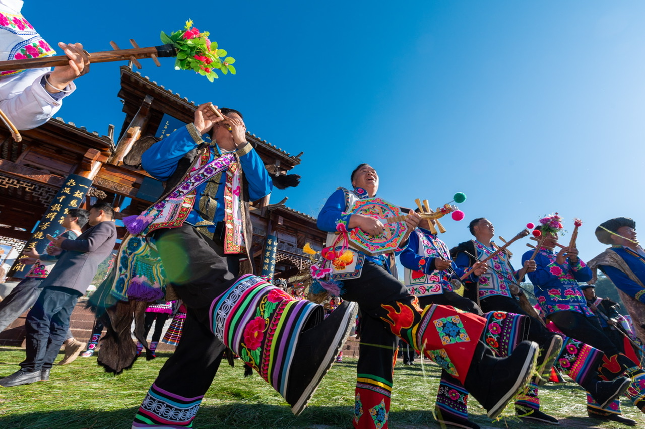 当地人常说:“会走路,就会跳脚,会说话,就会唱歌。”拦门酒过后,昙华本土民间艺人和昙华彝剧团,踩着欢快的民族音乐节拍,手搭肩围成圈圈,踏脚跺地,热情洋溢的舞蹈让直播间也跟着热闹起来。