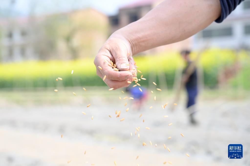 3月13日,在湖南省娄底市双峰县井字镇花桥村,农民在田间播种。