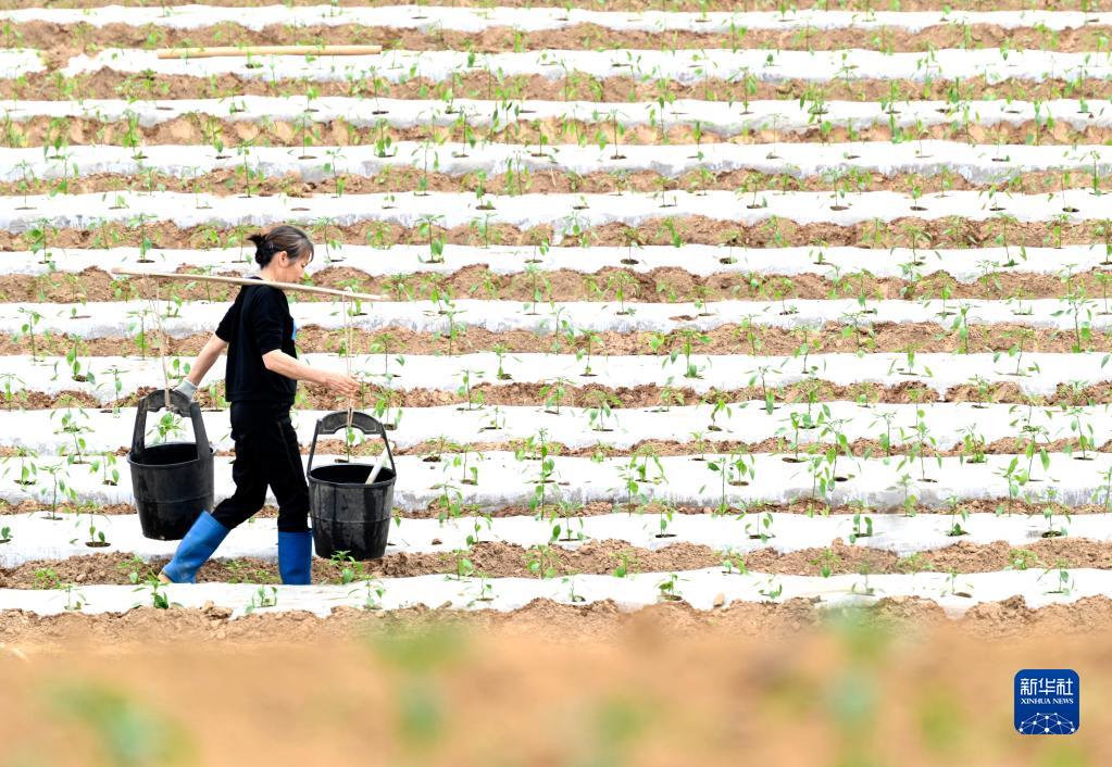 3月13日,在广西柳州市柳东新区雒容镇坭桥村,村民在地里给刚种植的辣椒苗浇水。