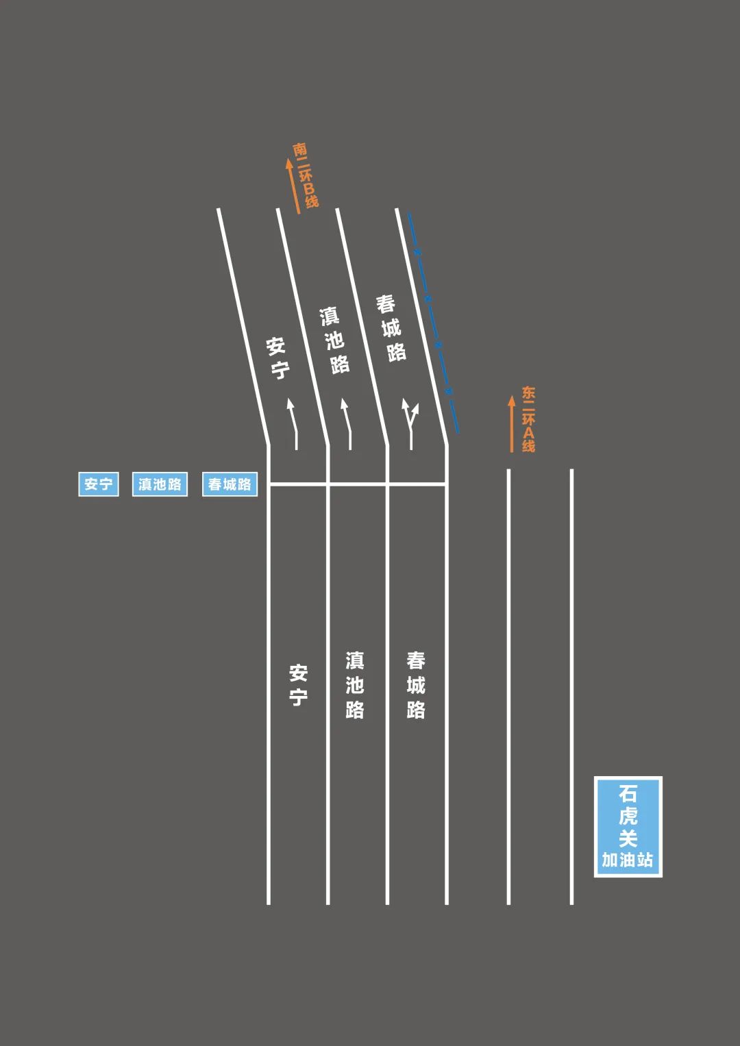 在昆石高速进入南二环B线的三条车道内增加指引方向路名,从左至右依次为:“安宁”、“滇池路”、“春城路”,同时将三条车道的道路标线由虚线变更为实线。