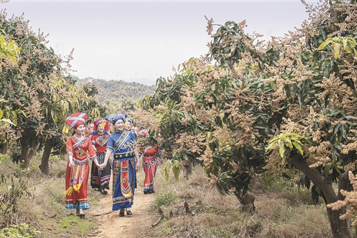 近日,在田东县祥周镇联合村,芒花飘香的果园吸引游客前来打卡。