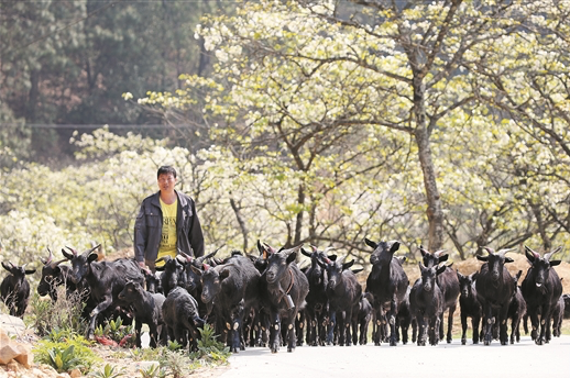 隆林金钟山乡群众赶着羊群穿过油桐树林。