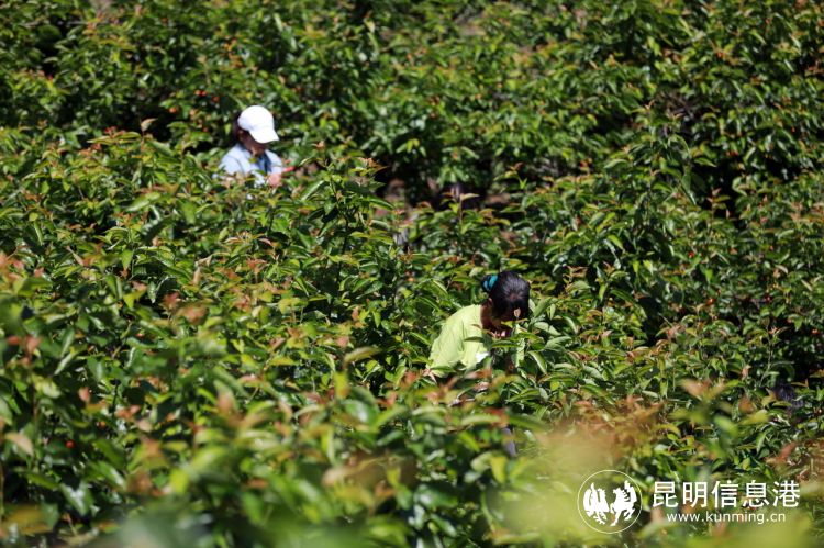 昆明信息港讯 记者李莹 刘莹 “枝头新缀璎珞珠,一树樱桃栏晴昊。”每年春天,粒粒鲜红、酸甜可口的樱桃是昆明人不会错过的舌尖美味。清明刚过,宜良县北古城镇米户村近万亩樱桃已经鲜红挂果。全市少见的“红玛瑙”樱桃是米户樱桃的一大特色,眼下头水樱桃售价稍高,价格40-50元/公斤。4月中下旬是米户樱桃盛果期,鲜果售价将回落至20元/公斤左右,入园游玩免入园费。