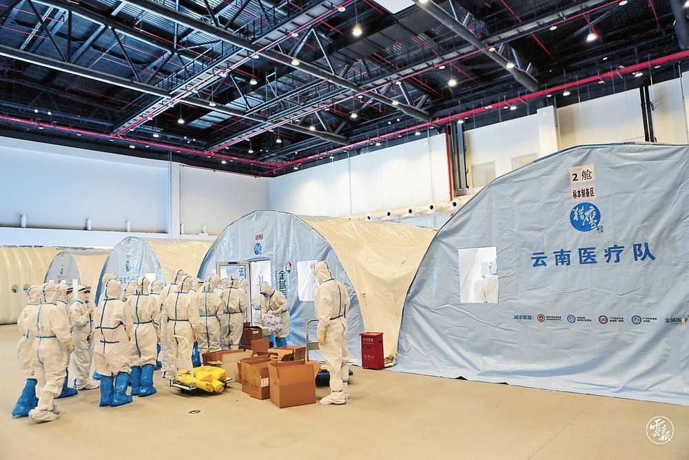 目前,第一批云南援沪医疗队已全面进入气膜实验室开展核酸检测工作,为上海抗疫助力。
