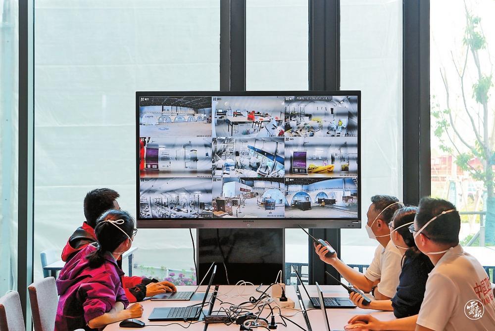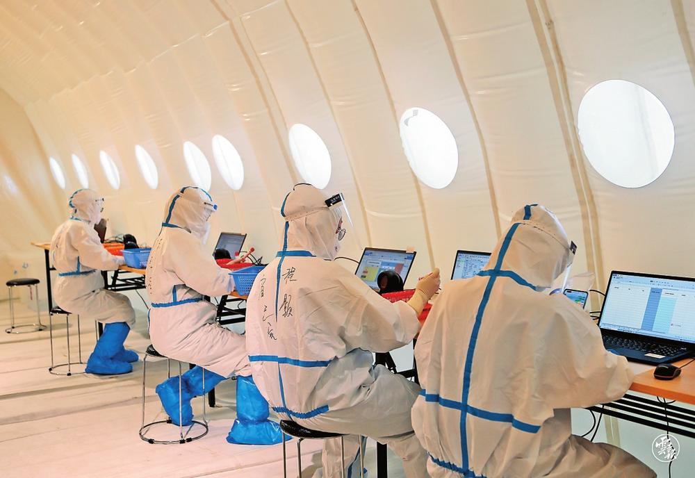 11时45分,队员们有序进入6座气膜舱室。记者在红线外围看到,核酸检测样本送达实验室后,经初步消杀在样本接收区进行交接,包括进一步消毒、扫码录入等。准备完成后,样本分批送入气膜实验室,进行试剂添加、核酸提取、扩增检测,出具最终结果,形成标准化、规范化、自动化核酸检测流水线,大大提升了检测效率。