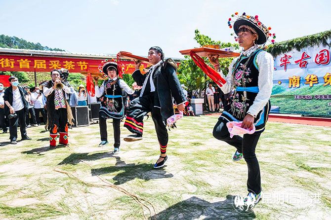 此外,采茶活动中,还有情歌对唱、阿卡舞等非遗文化欣赏。当地人说,“哪里有炊烟,哪里就会有生活;哪里有花衣裳,哪里就会有激情;哪里有激情,哪里就会有歌舞”。而“阿卡舞”彝语意为“跳芦笙舞蹈”,数百年来,“阿卡舞”演绎着民族历史文化的厚重与深邃。2017年6月,“彝族阿卡舞”被云南省人民政府公布为第四批省级非物质文化遗产代表性项目。三弦铮铮,阿卡舞狂,飞旋的舞步律动着生命的张力,优秀的民族传统文化代代相传。