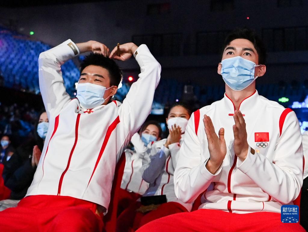 4月16日,速度滑冰运动员高亭宇(左)和短道速滑运动员武大靖在活动中鼓励台上运动员。