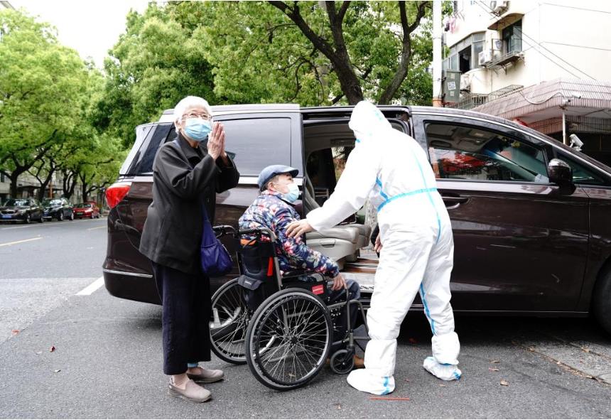 冯师傅接送的第一位血透患者是位88岁的老人。专车到达小区楼栋前,他协助家属将坐在轮椅上的老人,抬下台阶、坐上车。“谢谢师傅了,每次都这么麻烦你!”老人的女儿连声道谢。她介绍说,老人一直住在敬老院,疫情后血透不方便,就回到了家里。居委会很照顾,老人每周需要做两次血透、两次核酸检测,社区卫生服务中心都安排专车接送。