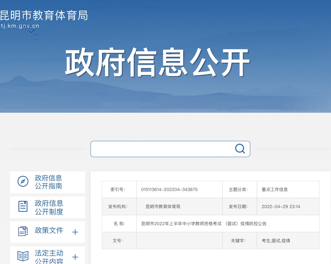 根据《云南省2022年上半年中小学教师资格考试(面试)公告》,结合省、市相关疫情防控要求,为做好面试期间的疫情防控工作,切实保障广大考生和考试工作人员的生命安全和身体健康,现将昆明市2022年上半年中小学教师资格考试(面试)疫情防控有关事项公告如下: