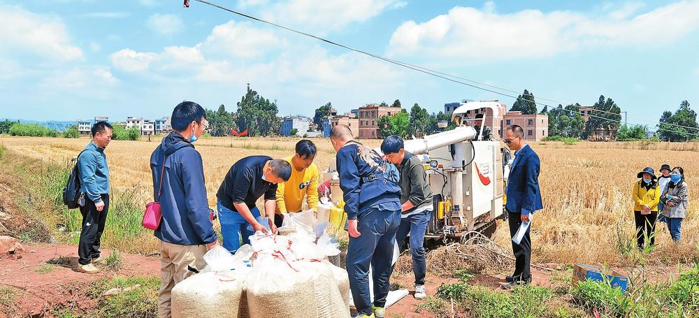 5月6日,省农科院组织专家对昆明市晋宁区晋城街道500亩小麦新品种“云麦112”连片绿色高效种植示范田进行现场实收测产验收。测产结果显示,500亩连片种植的“云麦112”平均亩产达654.85公斤,创小麦绿色种植的高产水平。