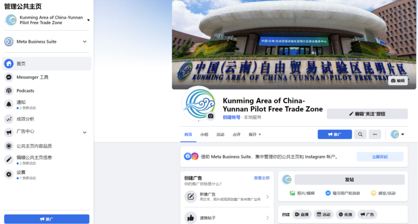 自贸试验区昆明片区Facebook平台官方账号页面