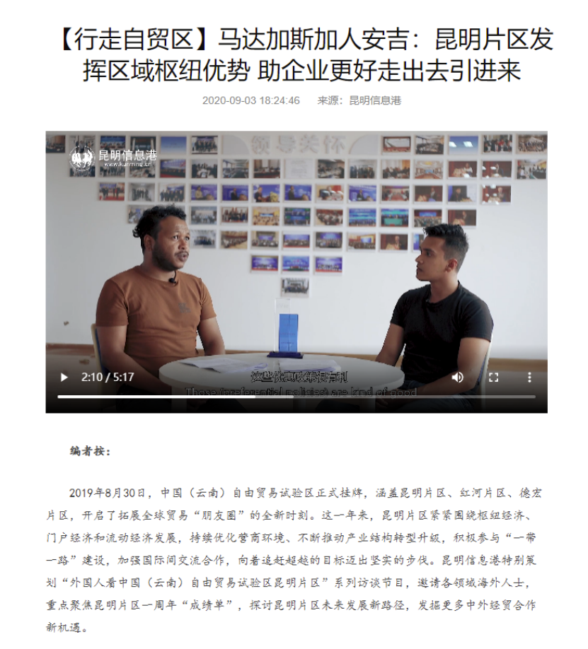 “外国人看自贸”系列访谈栏目,以“云访谈+线下访谈”的方式,通过对斯里兰卡国际商会会长柯莎乐·维凯玛娜雅克、缅北中华商会常务副会长吴敏奈、外籍教师菲尔·阿切尔和理查德、昆工留学生安吉等外国使节、企业负责人及留学生代表的视频访谈,以外国人的视角充分展示自贸试验区昆明片区的良好形象和发展前景。