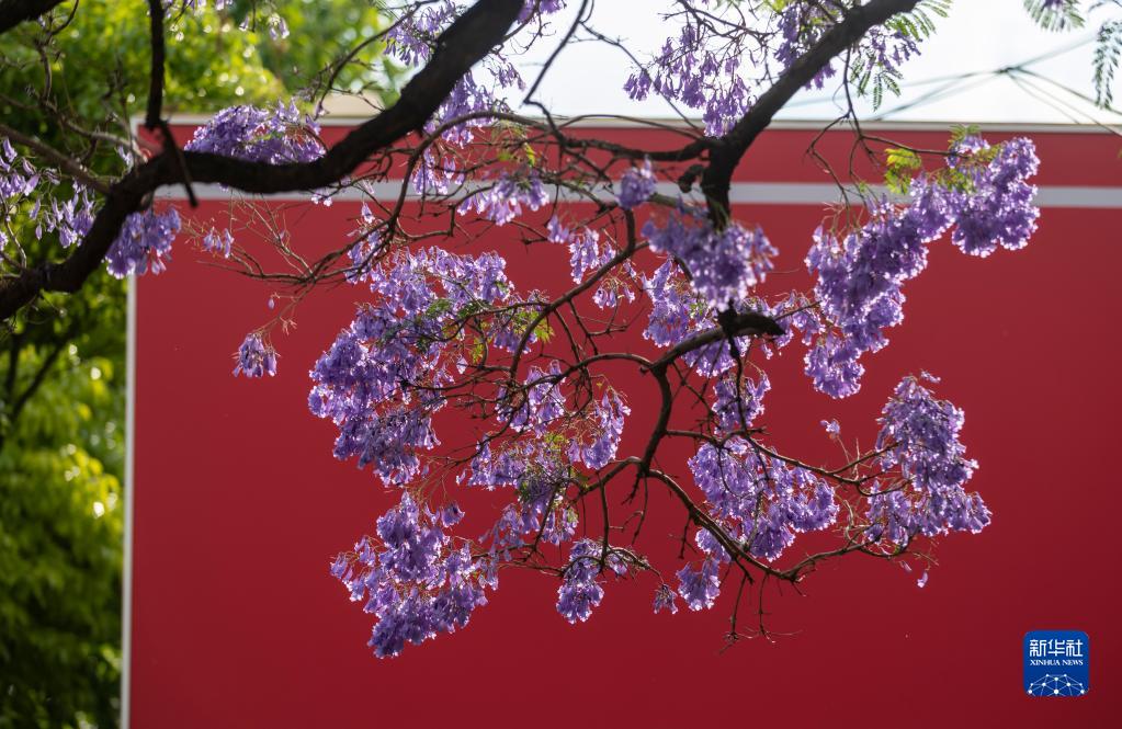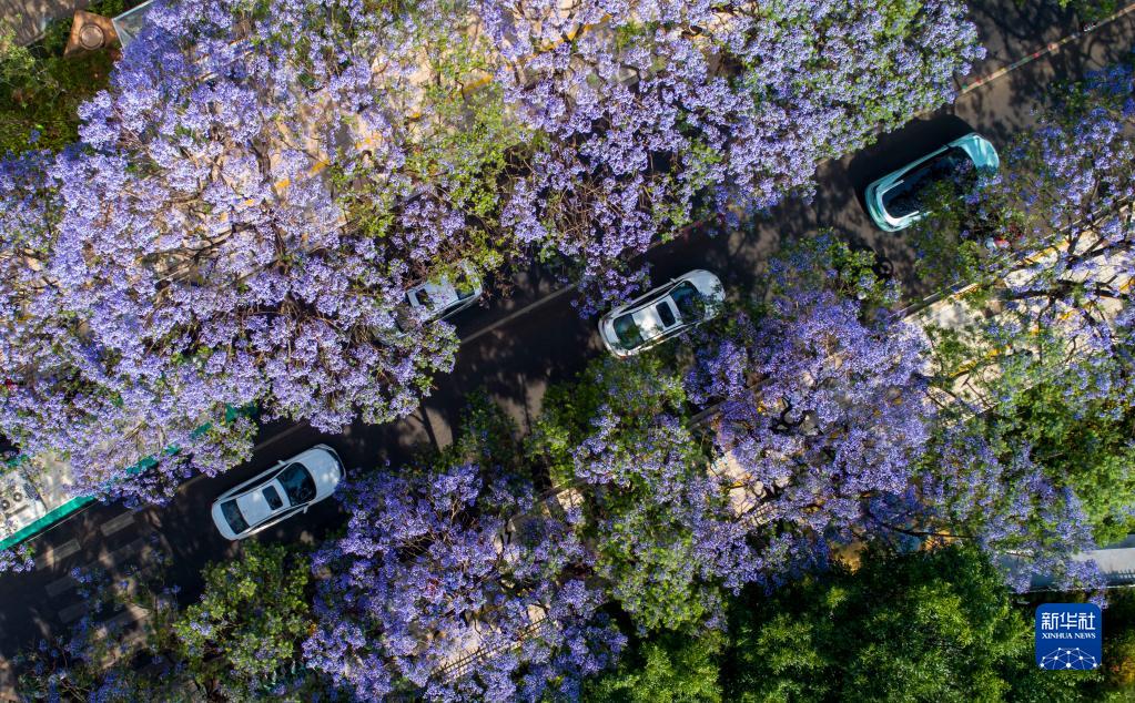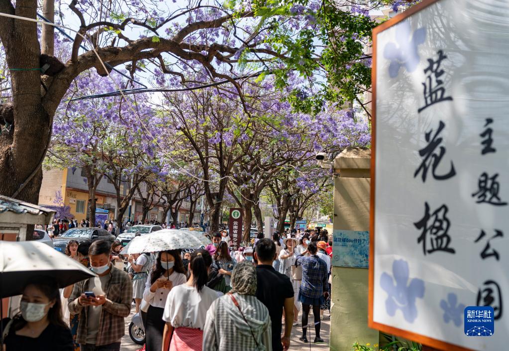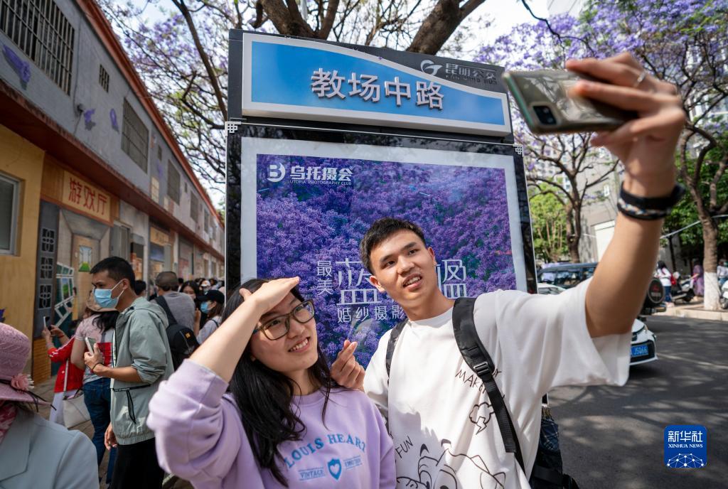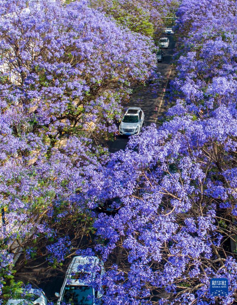 近日,昆明教场中路的蓝花楹进入盛花期,吸引不少市民游客到此“打卡”。近年来,昆明以花为媒,将美景与文旅、文创、文化等结合,为春城花都增添魅力和活力。