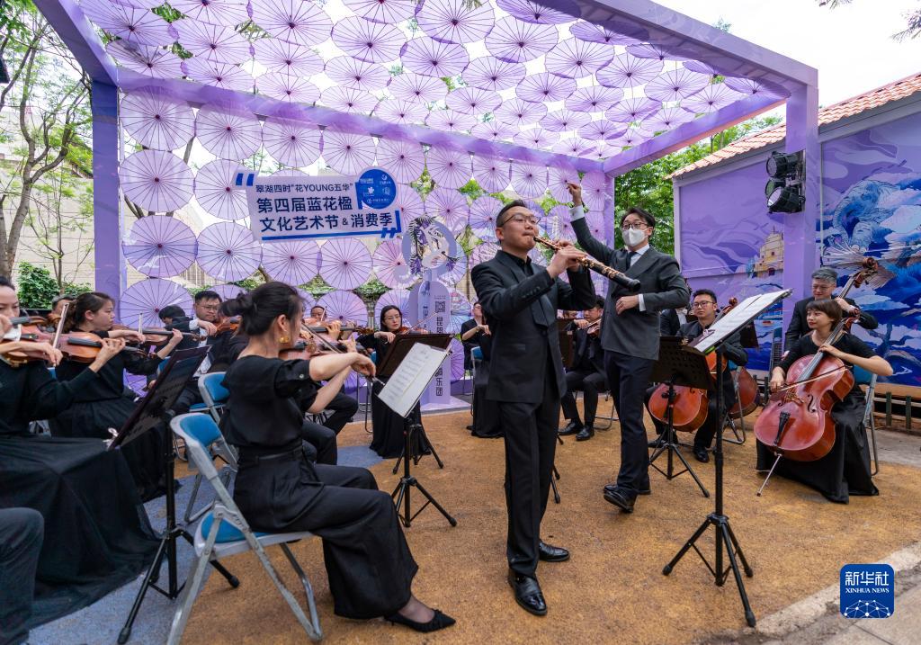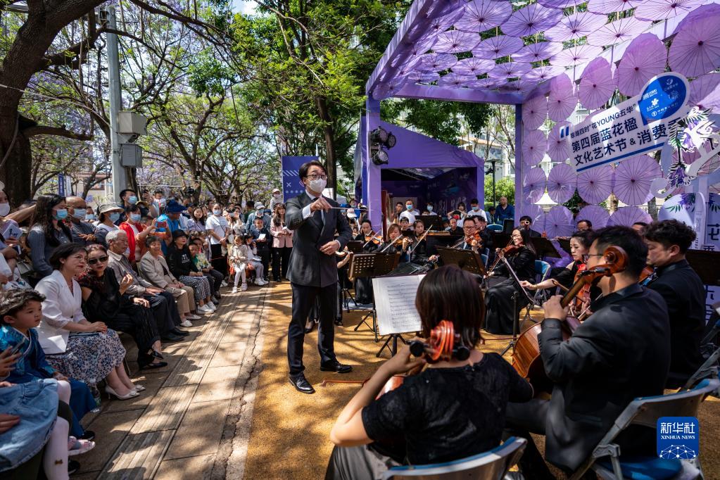 5月8日,昆明聂耳交响乐团在教场中路为游客举办题为“花季音乐会——蓝花楹”的交响乐表演。新华社记者 陈欣波 摄