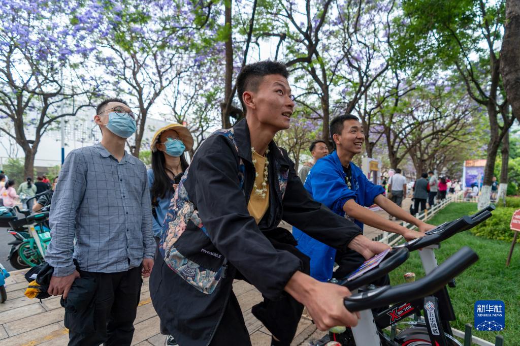 5月8日,游客在昆明教场中路设置的蓝花楹能量站排队体验动感单车。新华社记者 陈欣波 摄