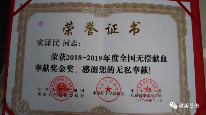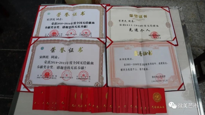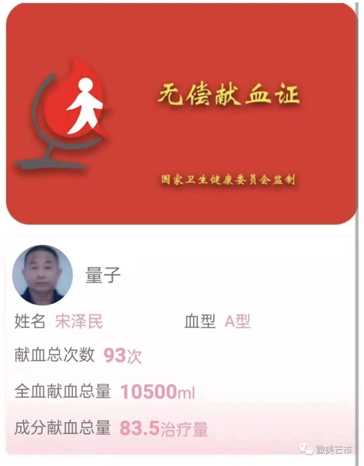 每当接到血液告急的消息,只要献血间隔期到期,自身满足献血条件,宋泽民都是有求必应,截止目前,他已经献血93次,全血献血总量10500ml。