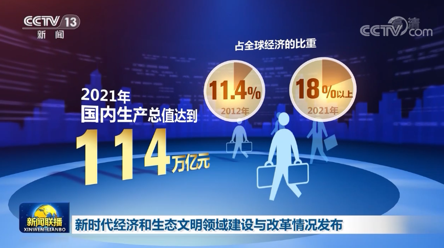 这十年,我国经济实力又迈上一个大台阶。2021年国内生产总值达到114万亿元,占全球经济的比重由2012年的11.4%上升到18%以上,世界第二大经济体的地位得到巩固提升。
