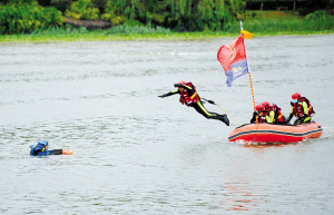 在呈贡洛龙湖公园举行受困人员应急救援演练。记者赵伟摄