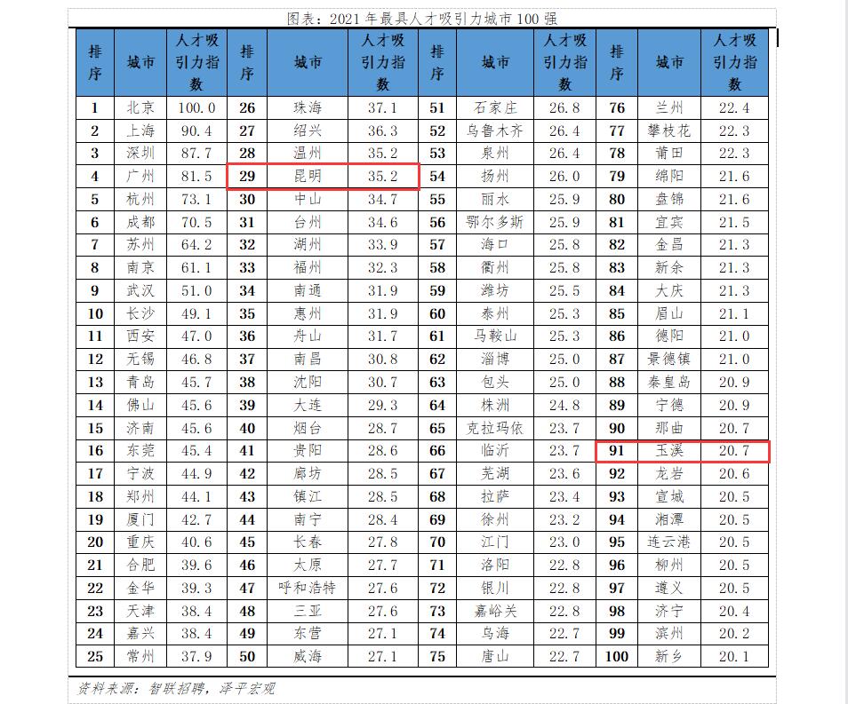 泽平宏观与智联招聘近日联合发布《中国城市人才吸引力排名:2022》,其中指出,2021年流动人才特征逐渐恢复至2019年水平,云南有昆明、玉溪两城入选2021年最具人才吸引力城市100强,昆明排在第29名,玉溪排在第91名。前三名被北京、上海、深圳占据。