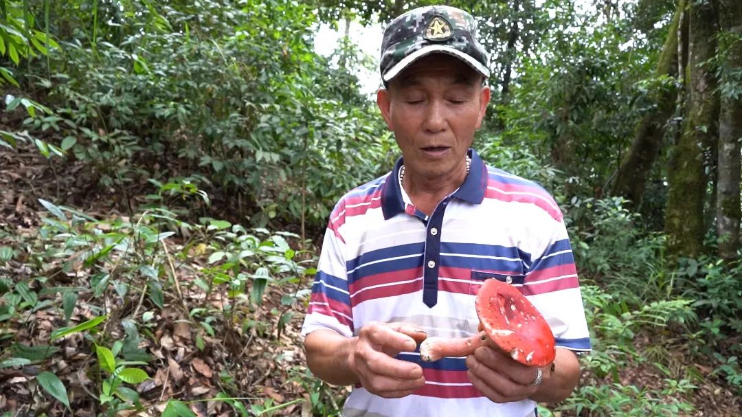 在哈渣村的后山上,李玉黑老人说,近几年,生态保护的好,很多之前快消失的可食用菌也慢慢冒出来了,这种大红菌一般是在每年的4月底到5月中旬才有,三天不采摘就会腐烂,但要根据地域气候等条件的不同而定大红菌的生长周期。