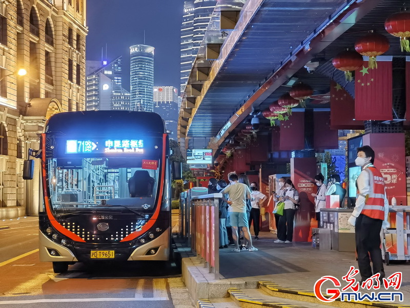 2022年5月22日,上海,71路中运量车驶入延安东路外滩起终点站,迎来一批乘客。(张锁庆摄/光明图片/视觉中国)
