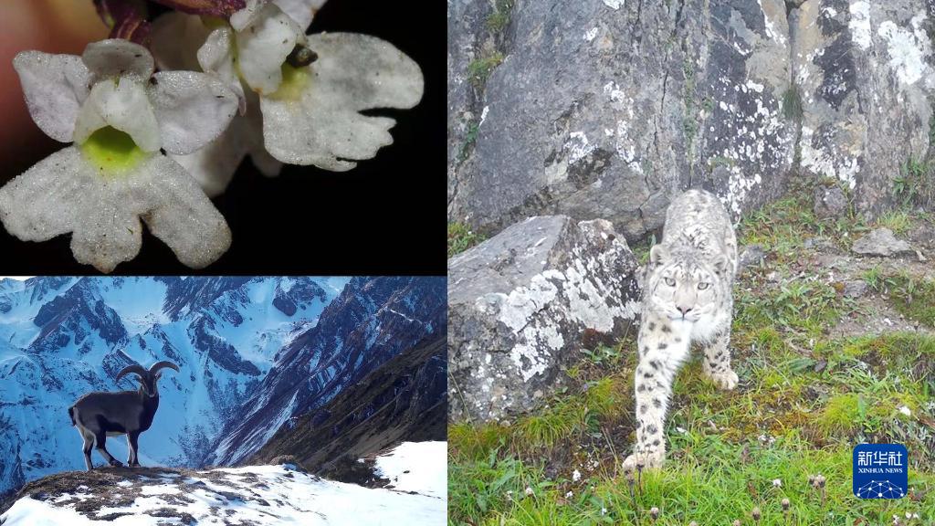 这是一张拼版照片:2020年工作人员在大熊猫国家公园卧龙片区发现了兰科植物新种卧龙无柱兰(左上);2021年1月22日,大熊猫国家公园王朗片区野外红外相机拍摄到的岩羊(左下);2021年8月19日,大熊猫国家公园王朗片区野外红外相机拍摄到的雪豹(右)。新华社发