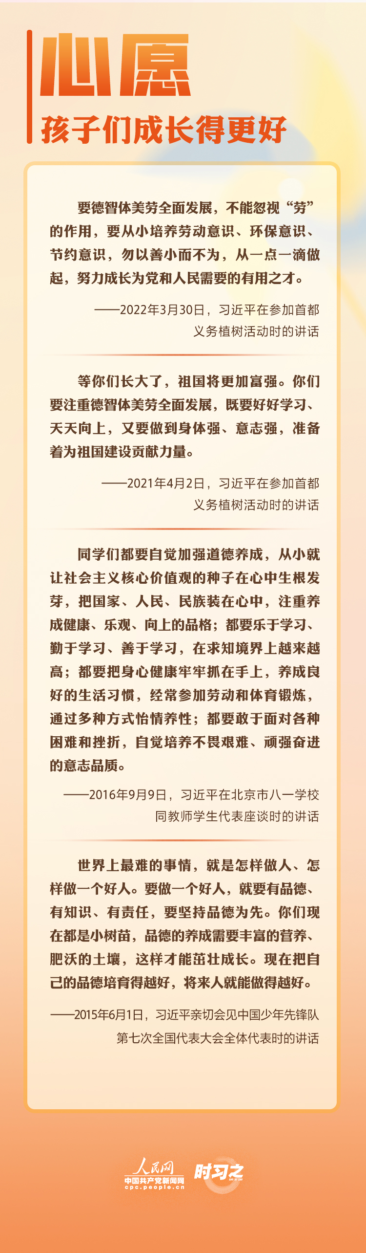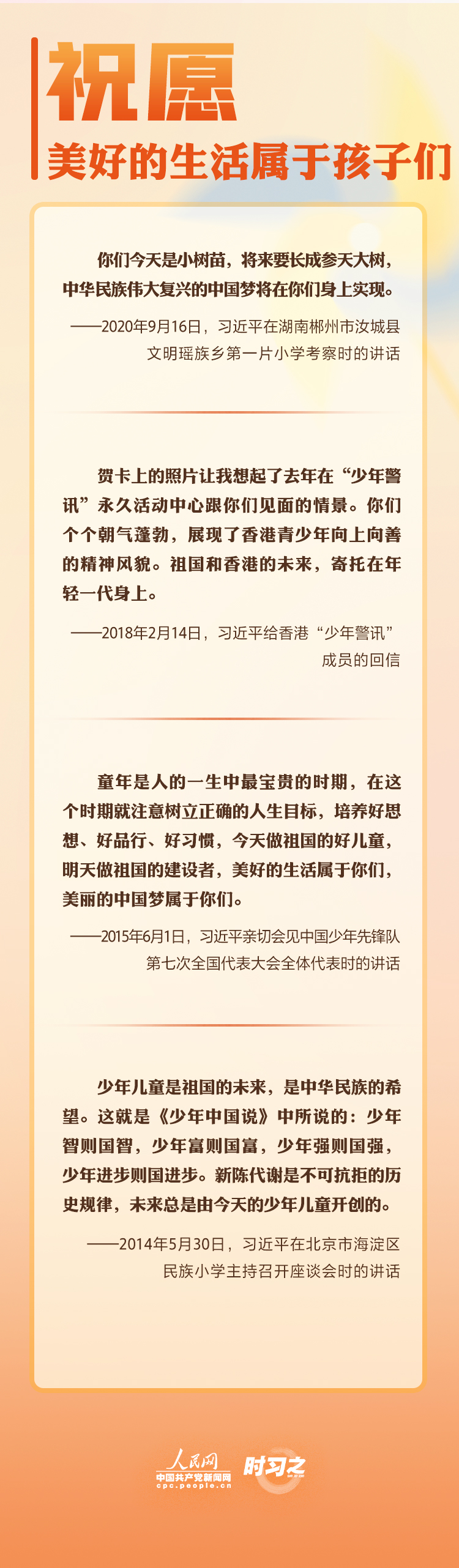 少年强则国强。当代中国少年儿童既是实现第一个百年奋斗目标的经历者、见证者,更是实现第二个百年奋斗目标、建设社会主义现代化强国的生力军。习近平总书记心系少年儿童工作,亲切关怀少年儿童健康成长,多次在不同场合表达对孩子们的殷切期望与浓浓关爱。