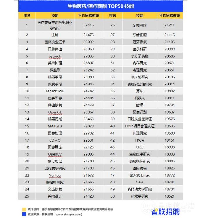 技能方面,“最能赚”的技能当属医美、牙科及数字化技能。在薪酬TOP50技能中,医疗美容主诊排名第一,月薪高达37416元。美容护理、微整形等上榜技能,也属于医美范畴。近年来,大众消费水平提升驱动医美行业快速发展,需求的快速增长带动医美相关行业薪酬水平攀升。此外,大众对口腔健康也愈加重视,齿科服务需求持续处于高位,口腔种植、种植修复、义齿修复、牙周治疗、牙周正畸等牙科相关的技能,排在薪酬榜前列。至于pytorch、机器学习、深度学习、TensorFlow、医学图像等数字化技能,收入也十分可观,这反映出行业正向数字化转型方向发展。