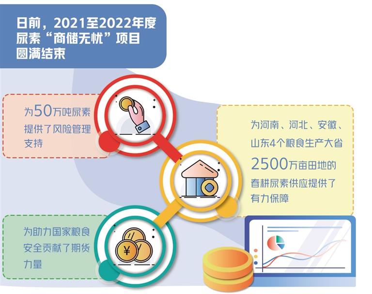 日前,2021至2022年度尿素“商储无忧”项目圆满结束,为50万吨尿素提供了风险管理支持,为河南、河北、安徽、山东4个粮食生产大省2500万亩田地的春耕尿素供应提供了有力保障,为助力国家粮食安全贡献了期货力量。