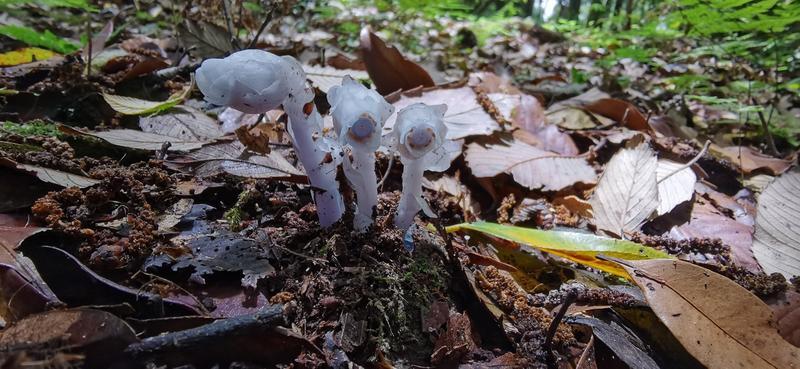 经过初步调查,昌宁县观音山国社合作林场董家凹林区发现的水晶兰数量较少,只有10多株。而在昌宁澜沧江县级自然保护区利东山片区内发现的水晶兰,分布在人迹罕至的原始密林中,这里一丛,那里一撮,每一株都通体雪白、晶莹剔透,长势健硕。与常规分布不同,这里的水晶兰分布具有面积大、数量多的特点。
