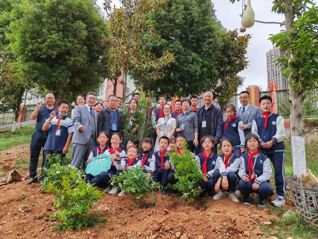 揭牌仪式后,云南民族大学师生带领四川师范大学附属昆明实验学校(天骄校区)的师生开展民族中草药种植活动。李毅与四川师范大学附属昆明实验学校(天骄校区)校长张强在该校“农耕园”共同栽下一株“团结树友谊树”——石榴树。