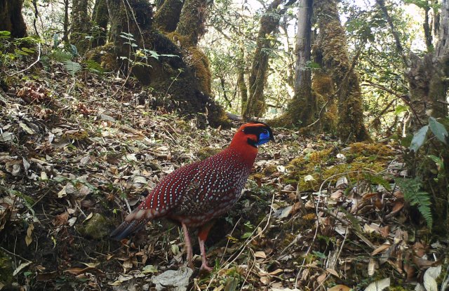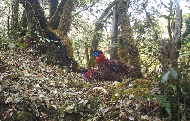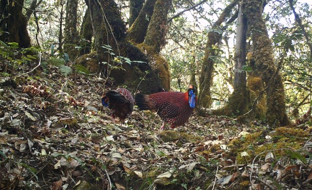 近日,中国科学院科考团队圆满完成了保山市龙陵小黑山省级自然保护区生物多样性第二次野外综合科考,当回收整理红外相机图片资料时,意外发现一种体羽布满灰色眼状斑的奇特鸟类动物。经中国科学院西双版纳热带植物园正高级工程师邓晓保鉴定,确定为鸡形目雉科角雉属动物红腹角雉。该物种属国家Ⅱ级重点保护野生动物,并被列入《中国生物多样性红色名录——脊椎动物卷》近危物种。在龙陵是首次拍到。