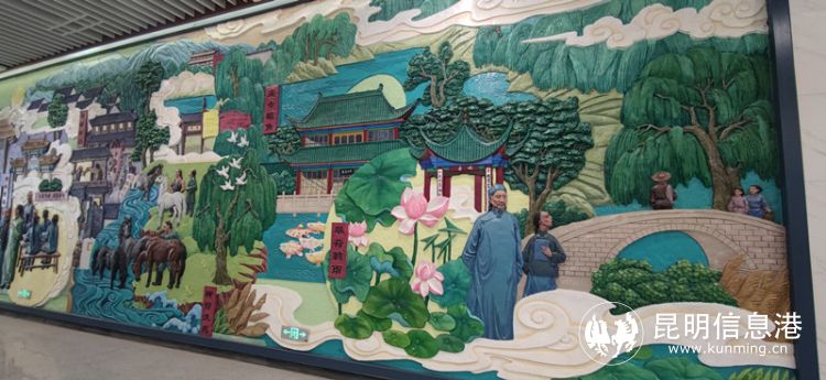 该站艺术文化墙以文化瓷砖为媒材,以云南省26个世居民族以及周边风景滇池和西山为主要表现内容,色彩丰富、肌理多变,呈现了云南省的丰富多样民族文化特色,表达了各民族团结、进步、安居乐业、热情好客的主题。