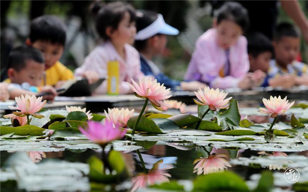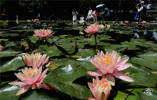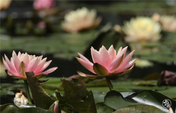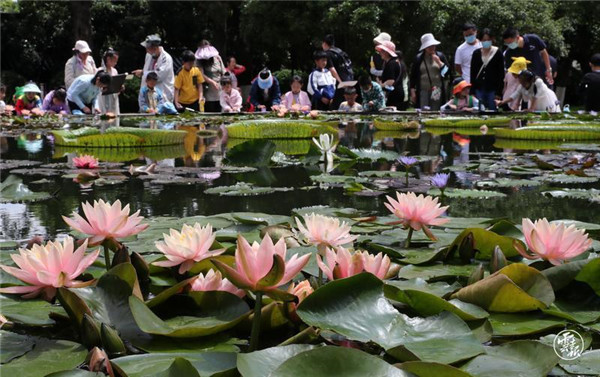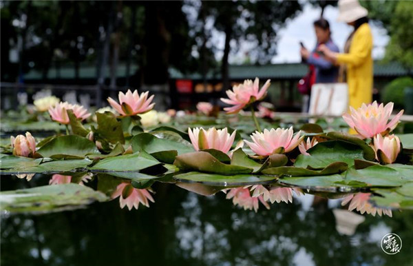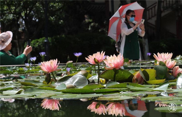 迎接夏至,昆明大观公园睡莲池中,红、白、黄、粉、紫的各色睡莲竞相绽放,花影照水中宛如美人凌波,在夏日中尽展曼妙之姿,花景甚是美丽,引得市民游人驻足池边观赏拍照。