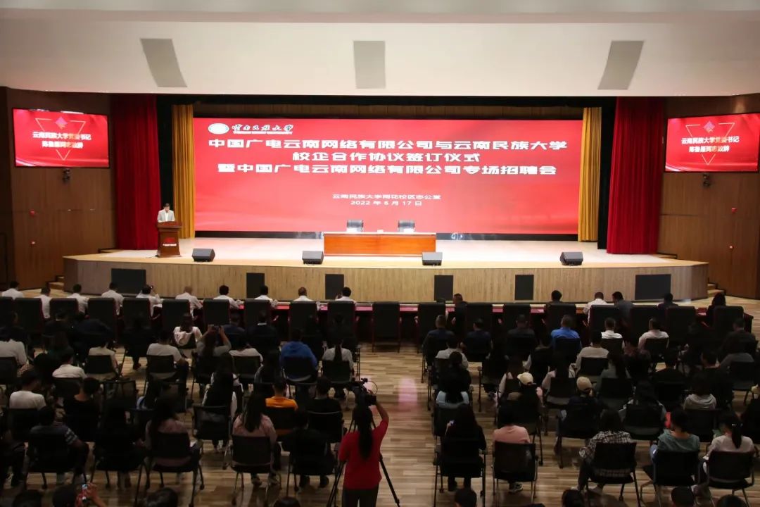 6月17日下午,云南民族大学与中国广电云南网络有限公司校企合作协议签订仪式暨中国广电云南网络有限公司专场招聘会在云南民族大学至公堂举行。中国广电云南网络有限公司党委书记、董事长和向东,党委副书记、总经理赵联涛,云南民族大学党委书记陈鲁雁,校长张桥贵,副校长何民出席签约仪式。活动由副校长李若青主持。