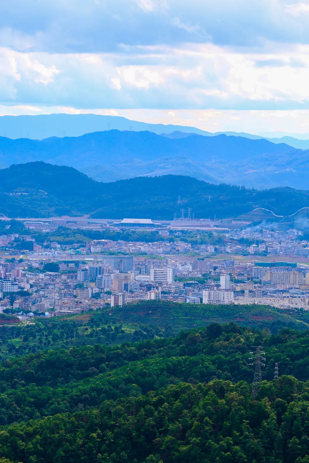 一层一层极目远眺:最近的思茅松林,回响着风鼓起的松涛阵阵;生态茶地里,还有茶农在采茶;正是普洱的吃菌季,林间小道上,小半天的功夫,已经两次碰到同一位捡菌子的村民;山脚,从普洱学院开始,一幢幢楼房错落有致,一直向城西的群山延伸,是这座城的人间烟火;视线所及,最远的建筑是开通半年的中老铁路普洱火车站,细细看的话,“普洱站”三个字可以辨认;偏北一点,就是思茅机场的跑道,落日的光从云层缝隙漏下,照得跑道如一条银河;再往远处看,苍翠的群山重重叠叠。南北长、东西窄,东高西低就是普洱中心城区的地形特点,站在城东的佛莲山顶看“我的城”,就像看了一幅这座城的剖面图,亲切又震撼。