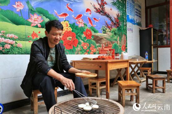 正在烘烤大米粑粑的李发顺。人民网 刘怡摄