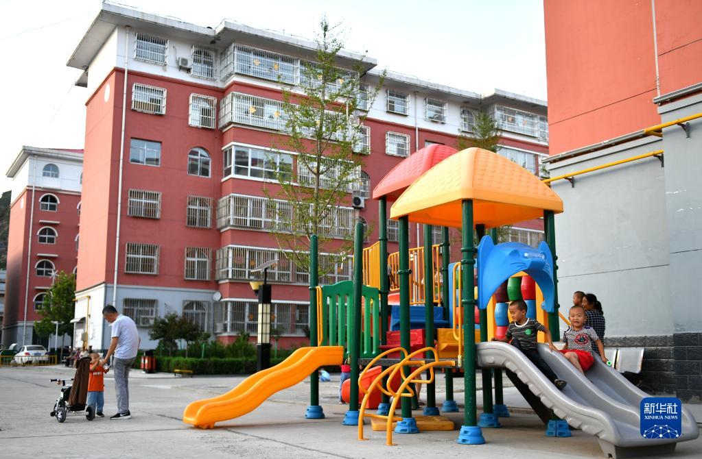 在陕西省延安市延川县文安驿镇梁家河小区,小朋友在滑梯上玩耍(2020年7月29日摄)。新华社记者 张博文 摄