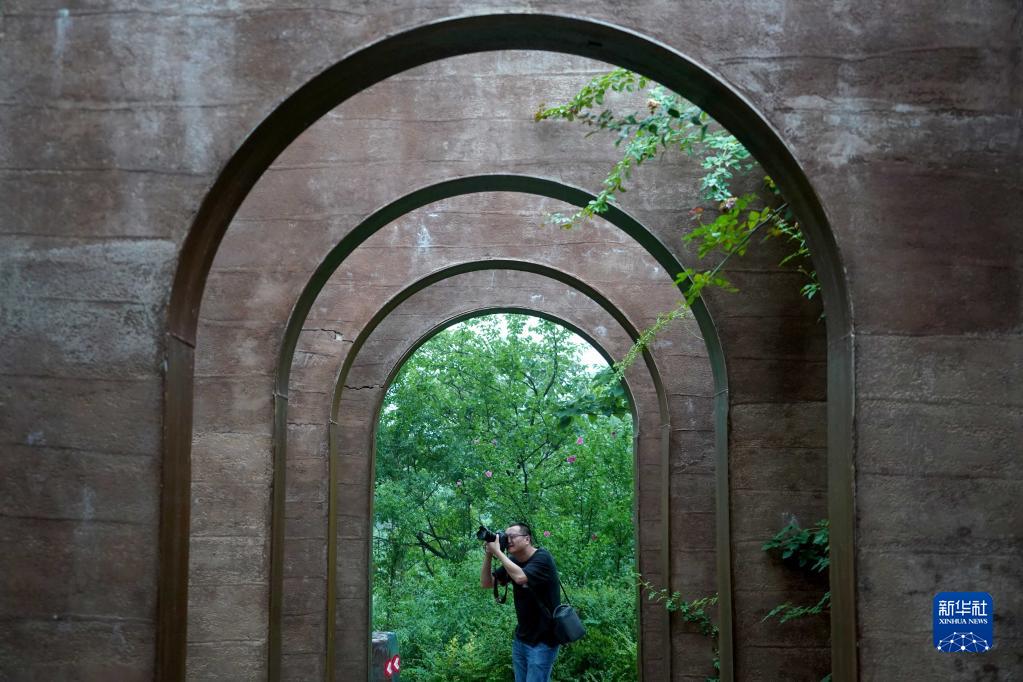 7月12日,游客在“洛阳三彩陶艺村”游览拍照。新华社记者 徐嘉懿 摄