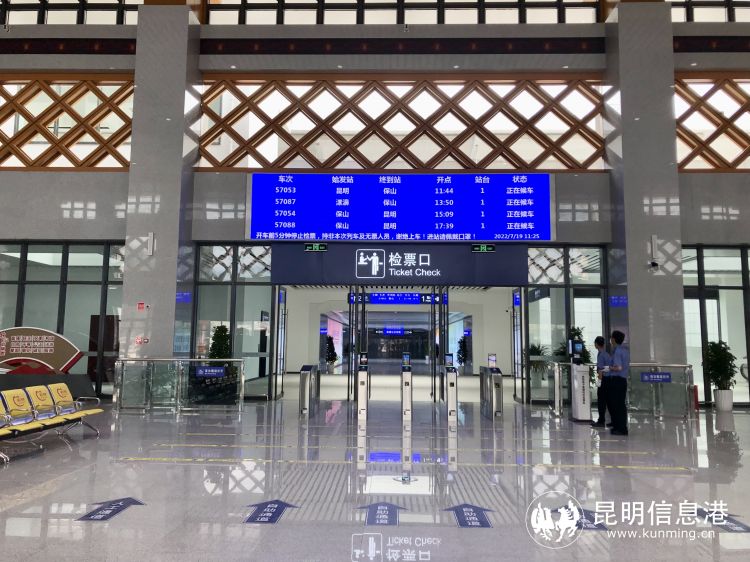 保山站值班站长鲁建丽介绍,保山站位于保山市隆阳区,车站为三等站。保山站候车大厅装修中采用了民族特色装饰,屋顶运用了棋盘格元素的同时融入了保山少数民族特色,更好地体现了保山风情。车站的建筑面积12000平方米,候车室面积6180平方米,最大可容纳旅客名乘客7700人。在候车室左右两边设置有候车座椅1852个,其中按摩座椅有360个,为旅客提供舒适候车环境。车站在进站口设置有检票闸机吧台,人工检票通道有两个,车站采用的是验检合一模式,即在检票进站的同时同步完成人脸核验。车站设有安检仪三台,在安检的同时,可以同步完成进站旅客的体温检测,也已经做好了疫情防控的各项准备工作。 在车站有一个售票综合服务中心,设有五个人,有五个售票窗口,在售票窗口提供的是售票、退票、改签、以及一些资讯等服务。站前广场附近有公交车等城市交通接驳,方便乘客出站后快速转乘。