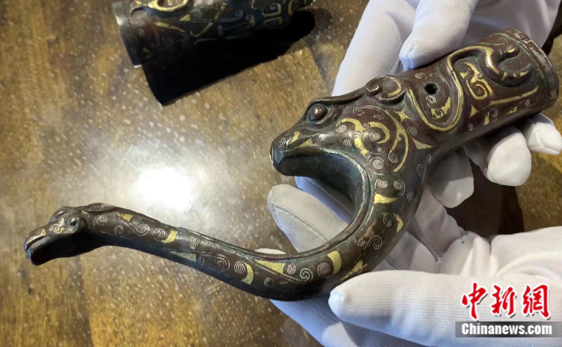 他向记者展示了战国时期的承弓器,这件与射箭活动息息相关的藏品,更像是一件艺术品。“金银镶在其中并进行抛光,纹饰非常精美,承弓器前边还设计了一个豹子头,这是速度与威严的象征。”黄金介绍道。